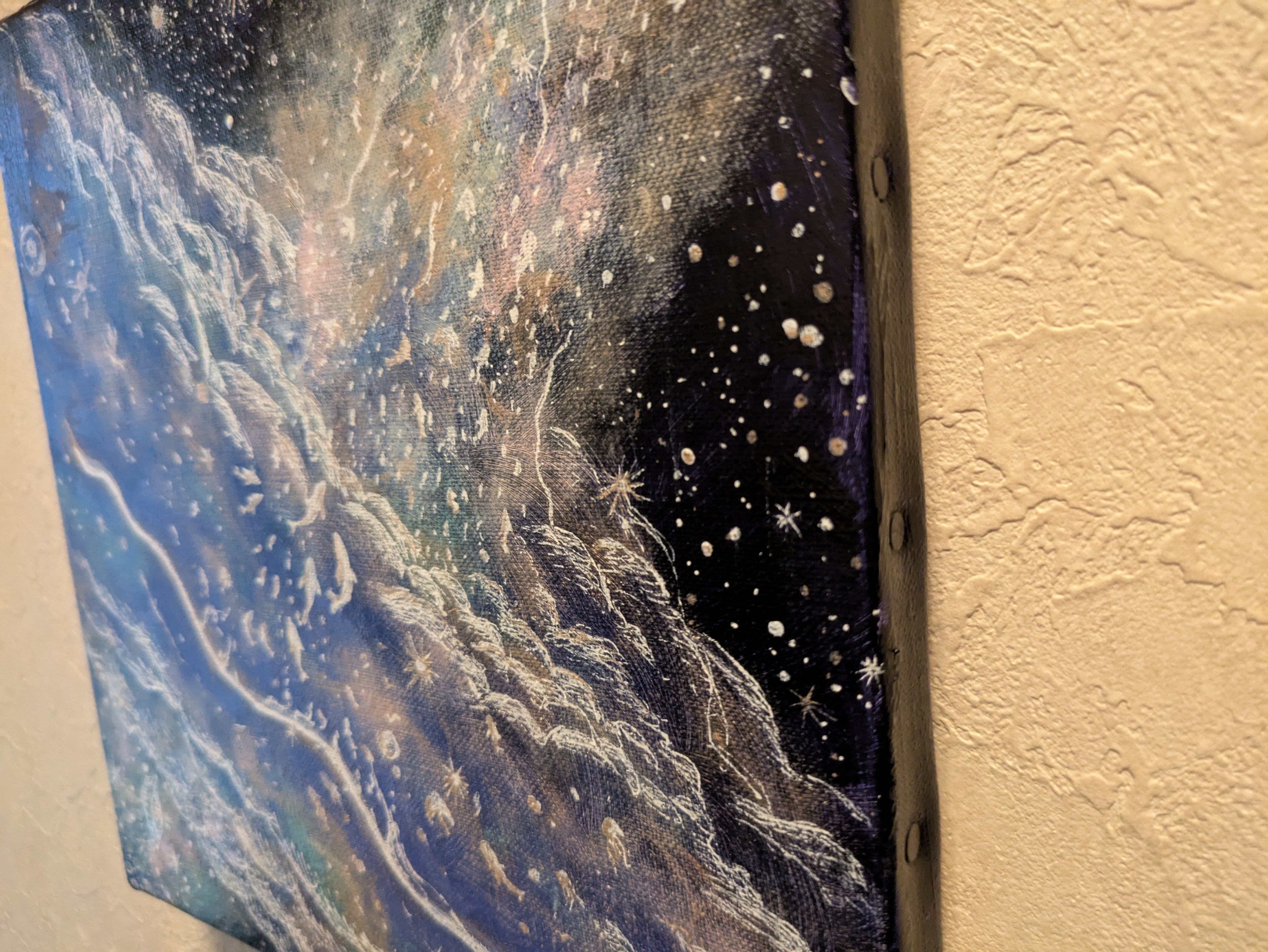 この絵は、意識体のイルカ“スピカ”が、魂として誕生した起点となる「星の湖(ほしのみずうみ)」を描いた一枚です。